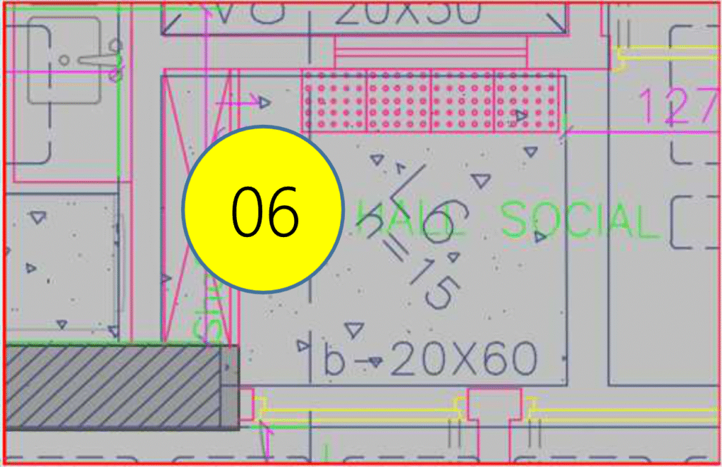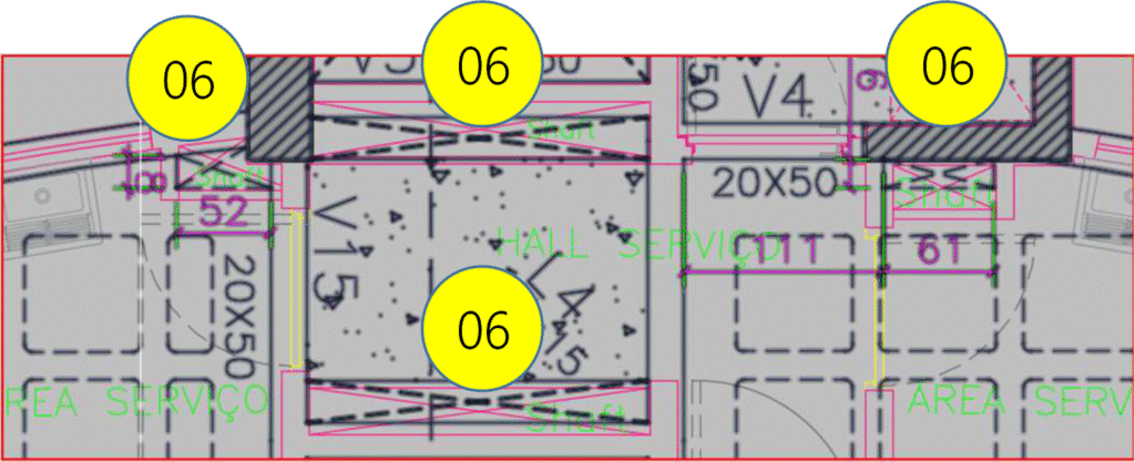 6. SHAFTS – Em Geral o dimensionamento dos Shafts não coincidem entre as plantas: área serviço, bwc serviço, bwc social, bwc suíte, área comum – Hall serviço; Hall social – Shaft inexistente na planta de estrutura e presente na planta de arquitetura;